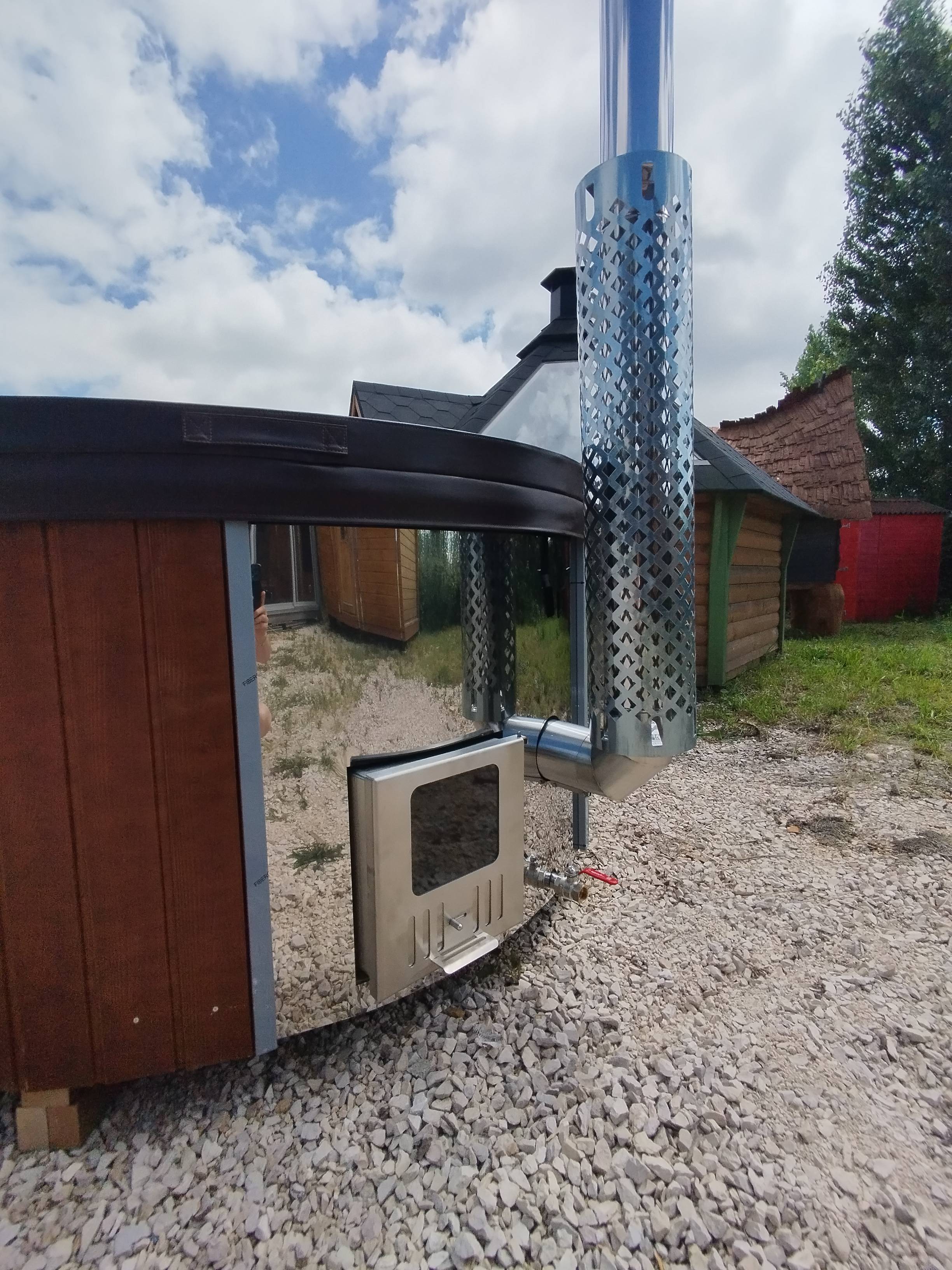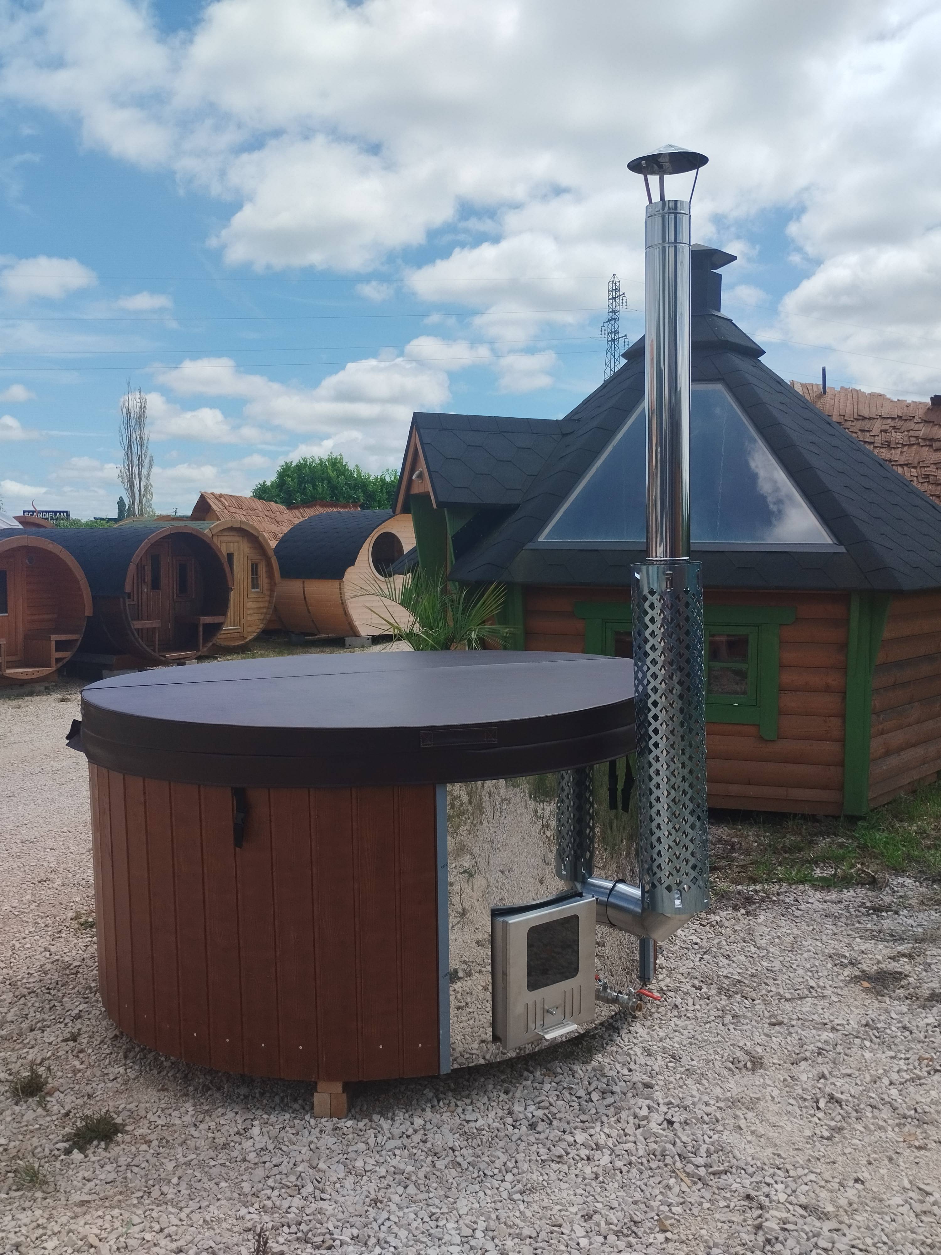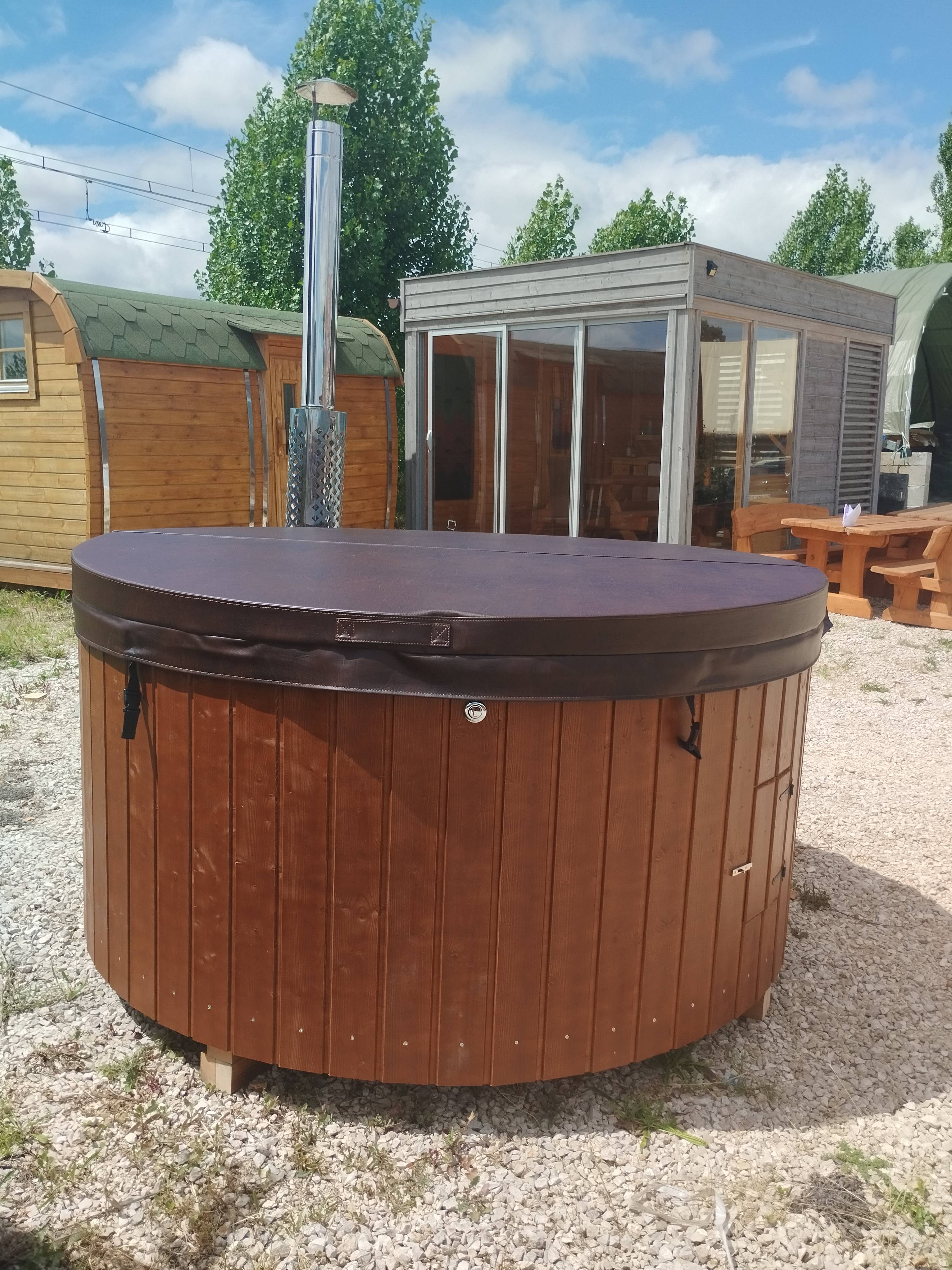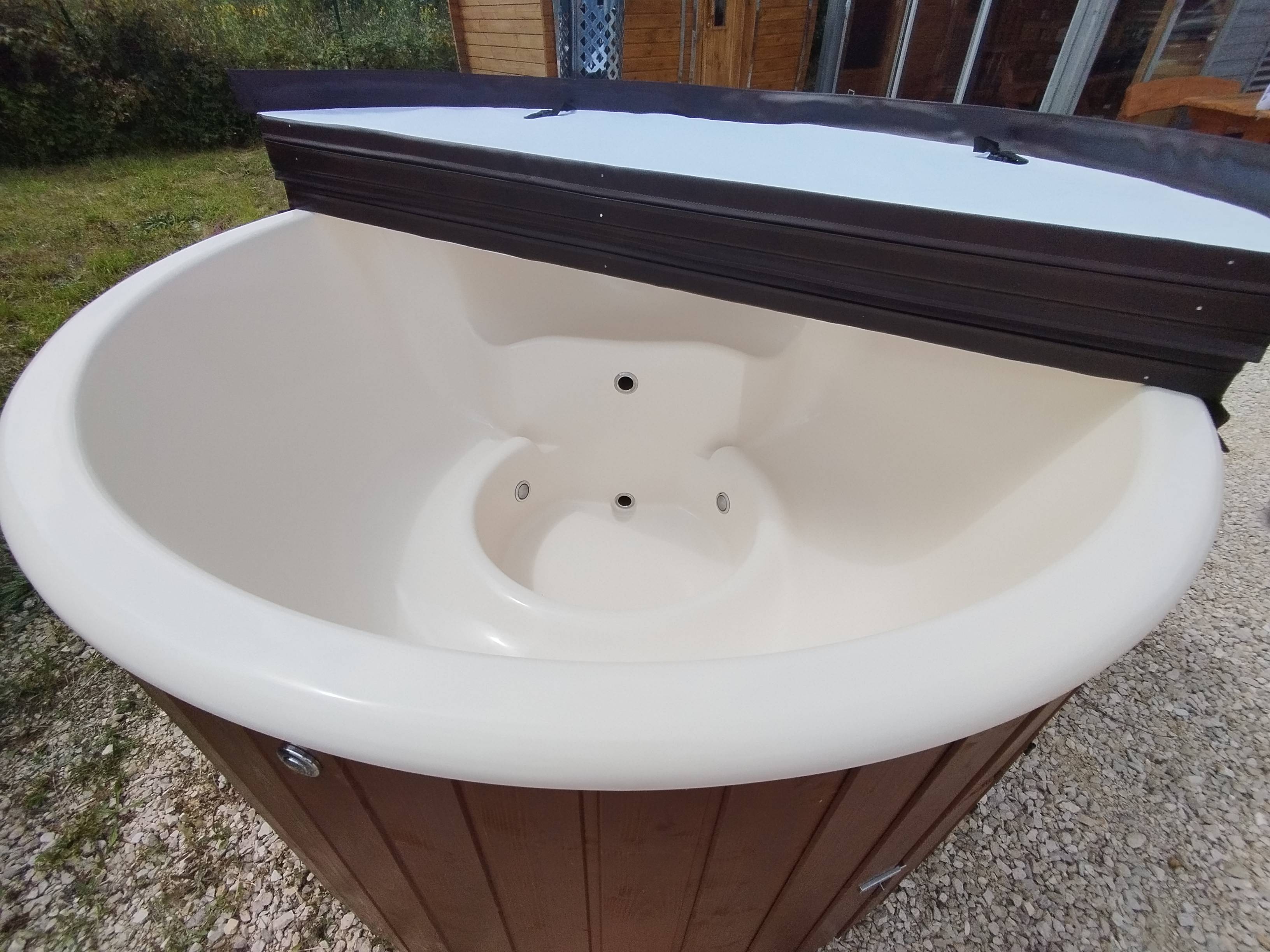 Le bain finlandais Deluxe 180, est en épicéa massif et intérieur fibre de verre (crème), ce qui lui confère une grande résistance, une facilité d'entretien et un confort d'utilisation appréciables. Livré tout équipé avec sa chaudière au bois (en acier 316) intégrée sous la cuve, la cheminée et la protection chaudière, il est également teinté (couleur noyer). La chaudière intégrée sous la cuve, vous permet de gagner de l'espace dans le bain, ainsi qu'une montée en température plus rapide. Ce bain est également équipé de la couverture isolante et de lumières leds, pour votre plus grand confort et une détente maximum.
