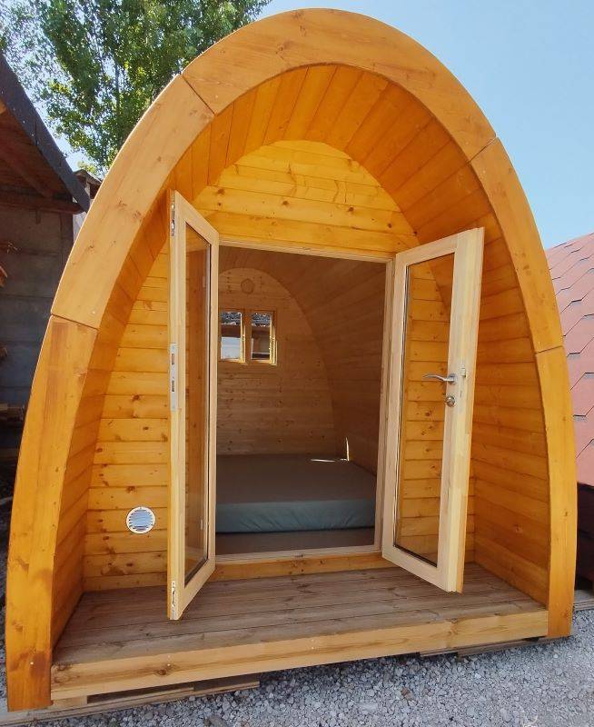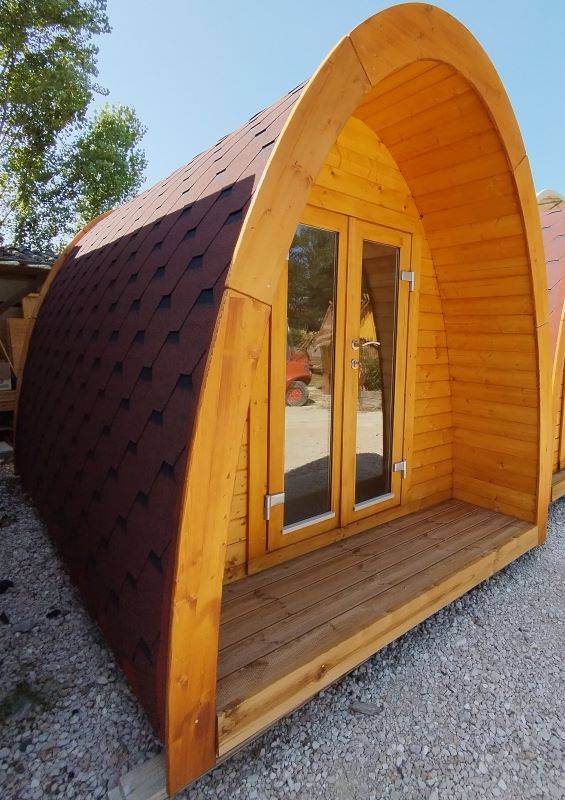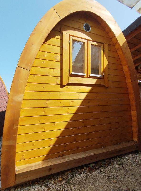 Le Camping Pod 350, est une jolie cabane originale de par sa forme en ogive, et confortable grâce à son isolation complète: sol, murs et toit, il est également muni d'une petite terrasse de 60cm sur l'avant.