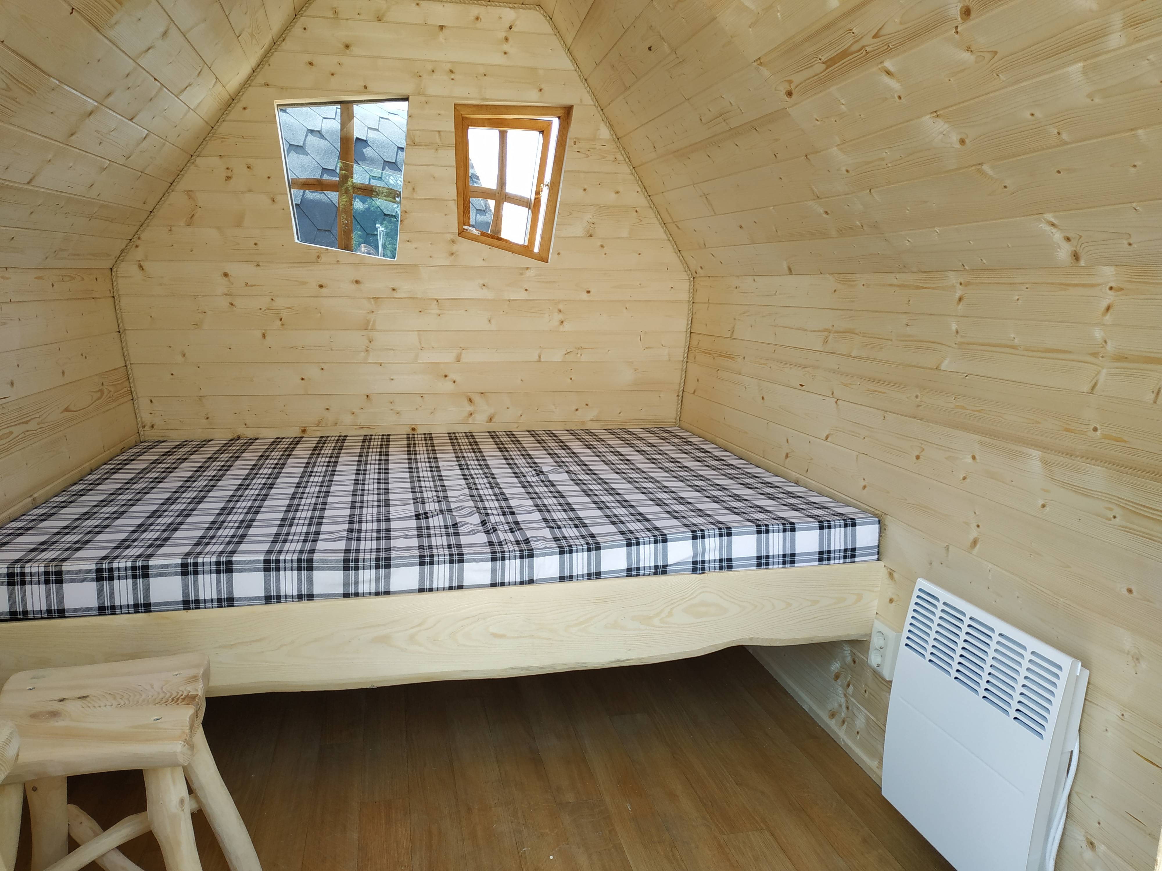 Elle décorera votre jardin tout au long de l'année avec sa jolie structure en pin, teintée marron, et ses tuiles bois pleines de charme. Pourvue de l'électricité (éclairage, PC, radiateur), d'un sommier double avec matelas, d’une table rabattable, de deux tabourets en pin, et isolée, elle est la pièce supplémentaire qu'il manquait à votre maison. Cette cabane est également équipée d'une petite penderie et d'une tablette arrondie d'angle.