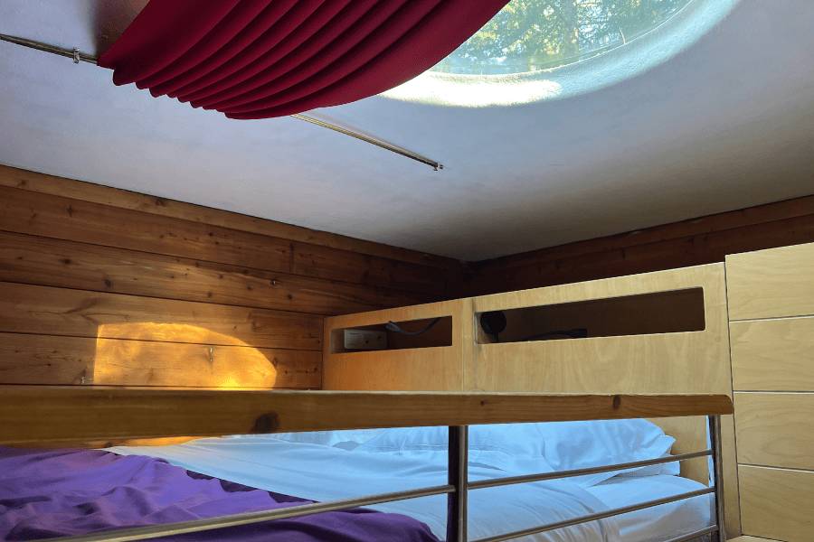 Avec sa forme cubique incarnant la stabilité, il est surmonté par un dôme transparent d’1 mètre de diamètre permettant d’observer le ciel depuis le lit en mezzanine.
