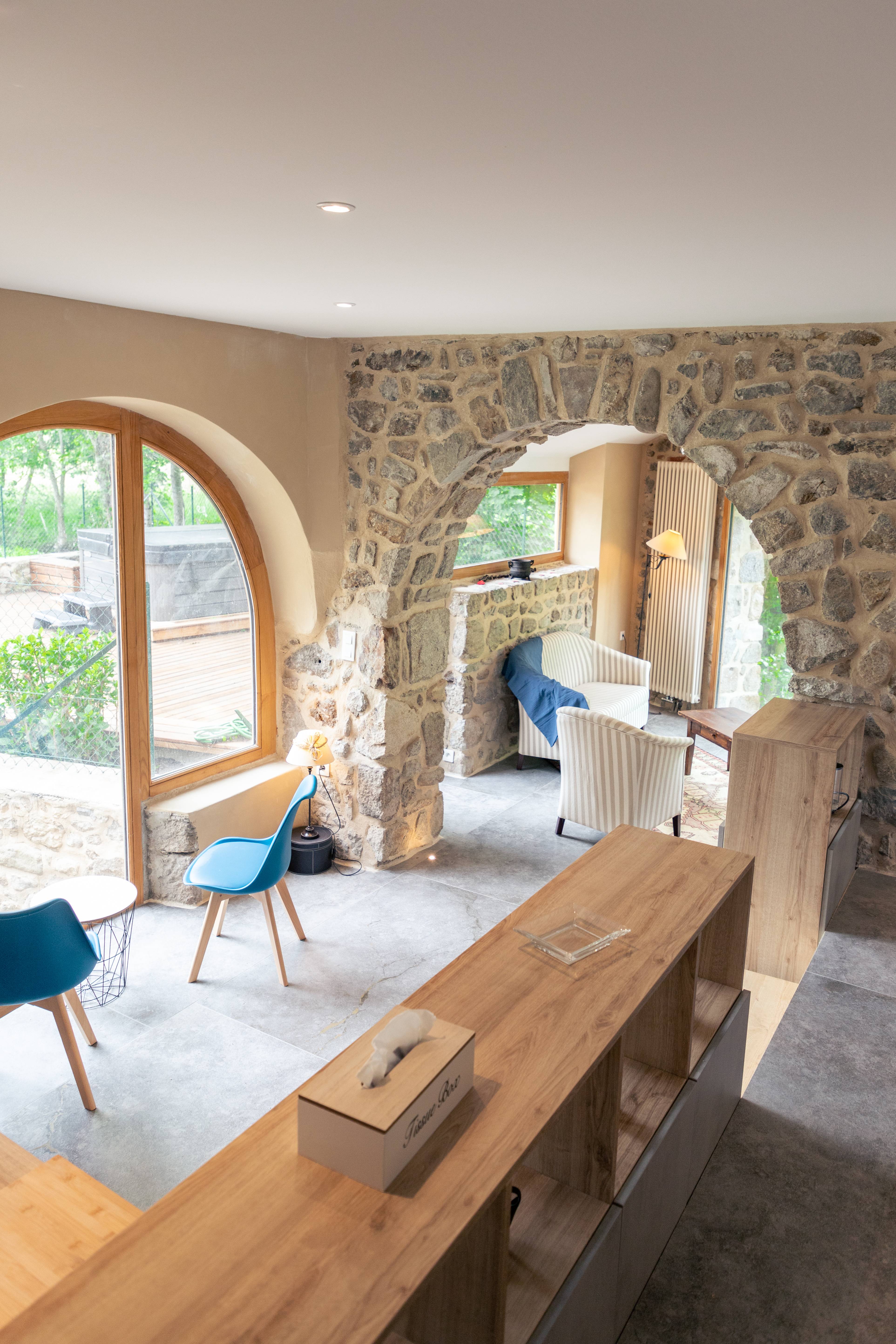 C’est certainement avec la grande chambre voutée, le cœur du spectacle et de l’originalité de notre gite ! Vous êtes dans la rivière ! Vous ne faites plus qu’un avec elle ! Le mobilier, là encore est pensé comme un rappel de rusticité avec toute la modernité des formes actuelles d’inspiration nordique. Là encore, nous avons souhaité donné un petit signe particulier et original à l’éclairage avec une recherche du contraste dans le matériau et l’effet objet rappelant l’eau.