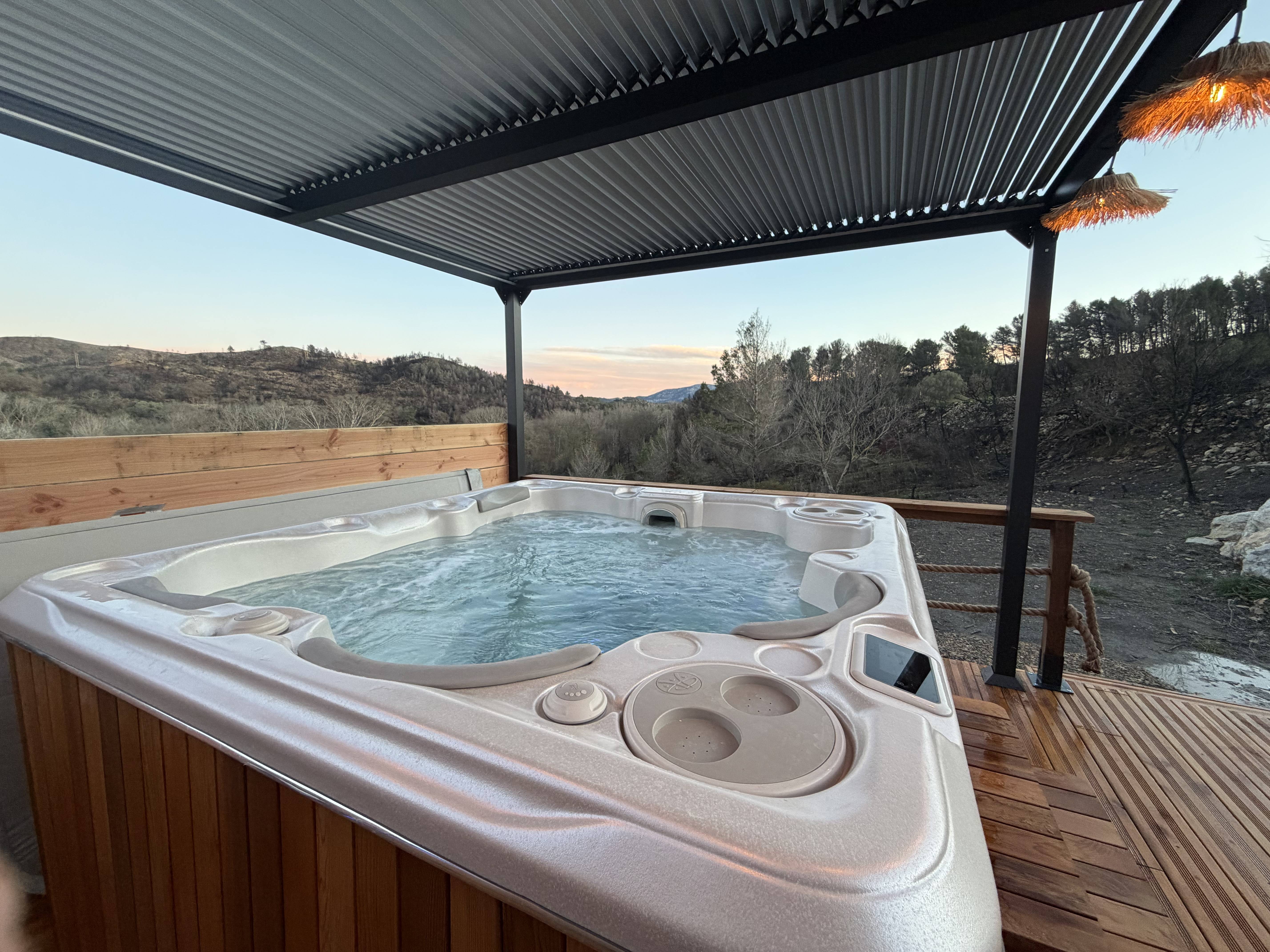 Le jacuzzi est privatif ainsi que tout le dôme, pas de partage - salle de bain privative et toilette séparé - partie salon chambre et kitchenette privative - terrasse privative et parking gratuit privée
