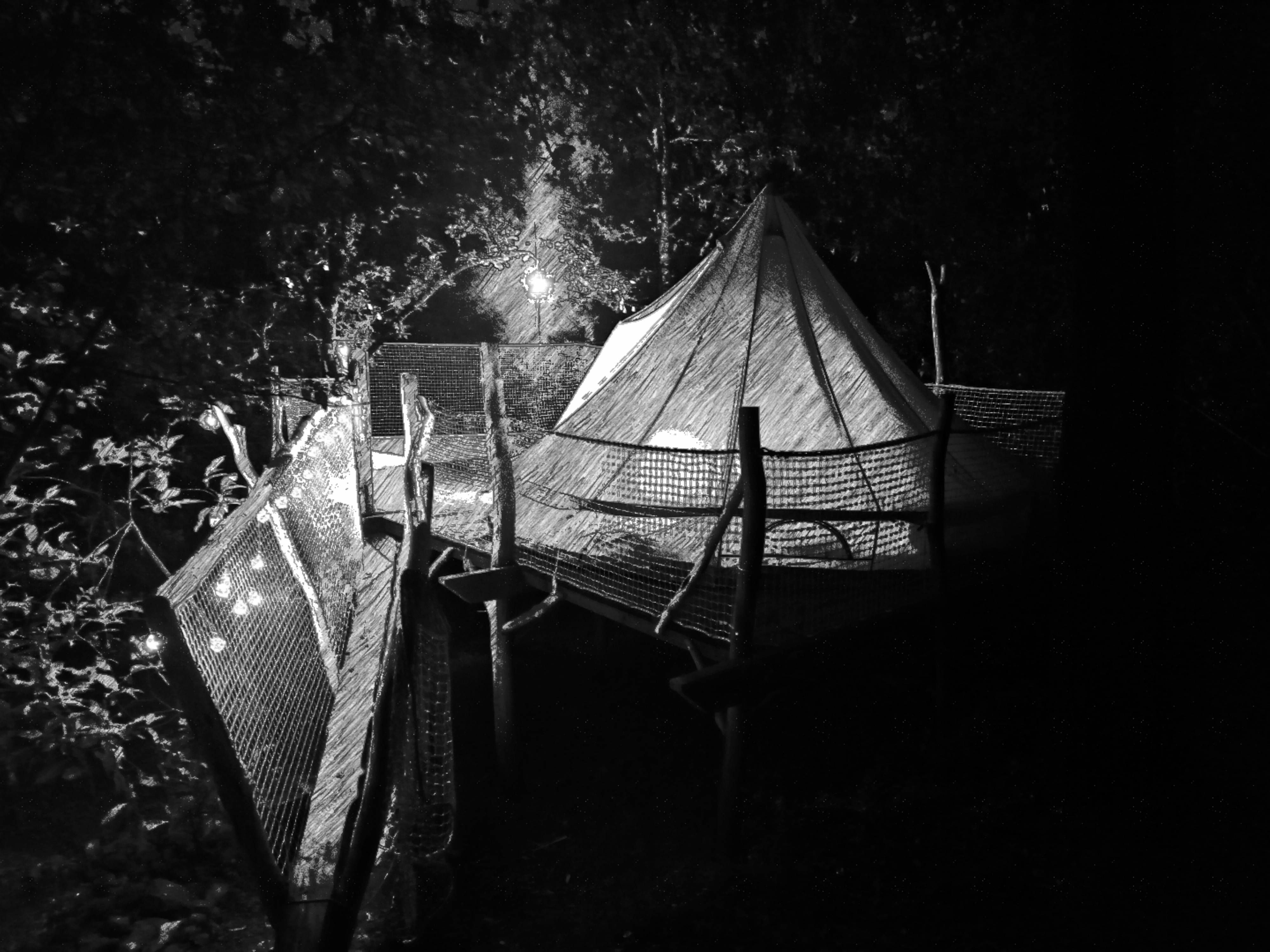 1 tente Hibou de 5 mètres de diamètre sur plateforme pilotis de 40 M2 avec hamac suspendu de 12 M2 dans le vide perché à 4 mètres . A l' intérieur se trouve une lit en 140 pour 2 personnes ainsi qu'un canapé convertible en 140, couvertures polaires, coussins.