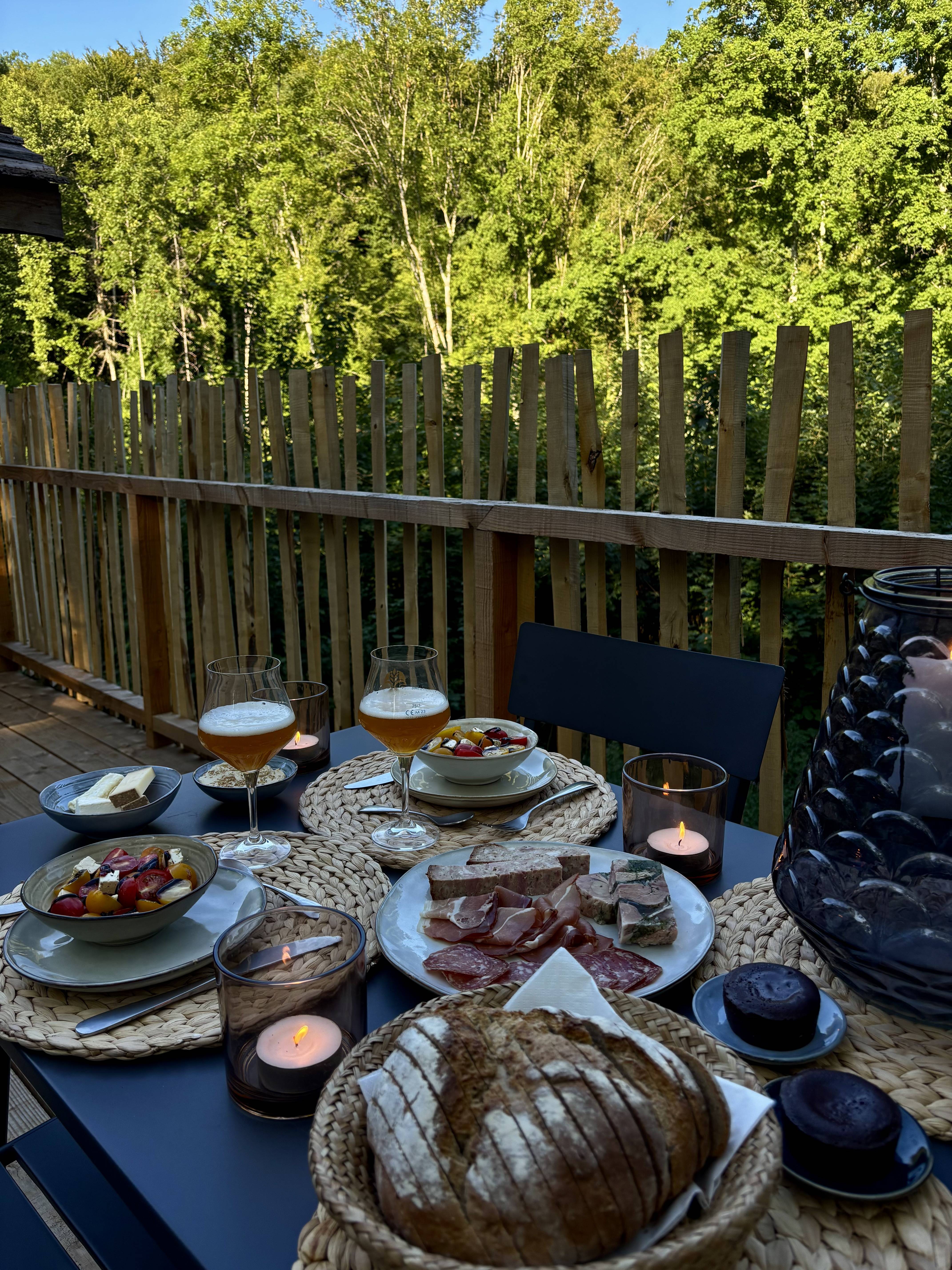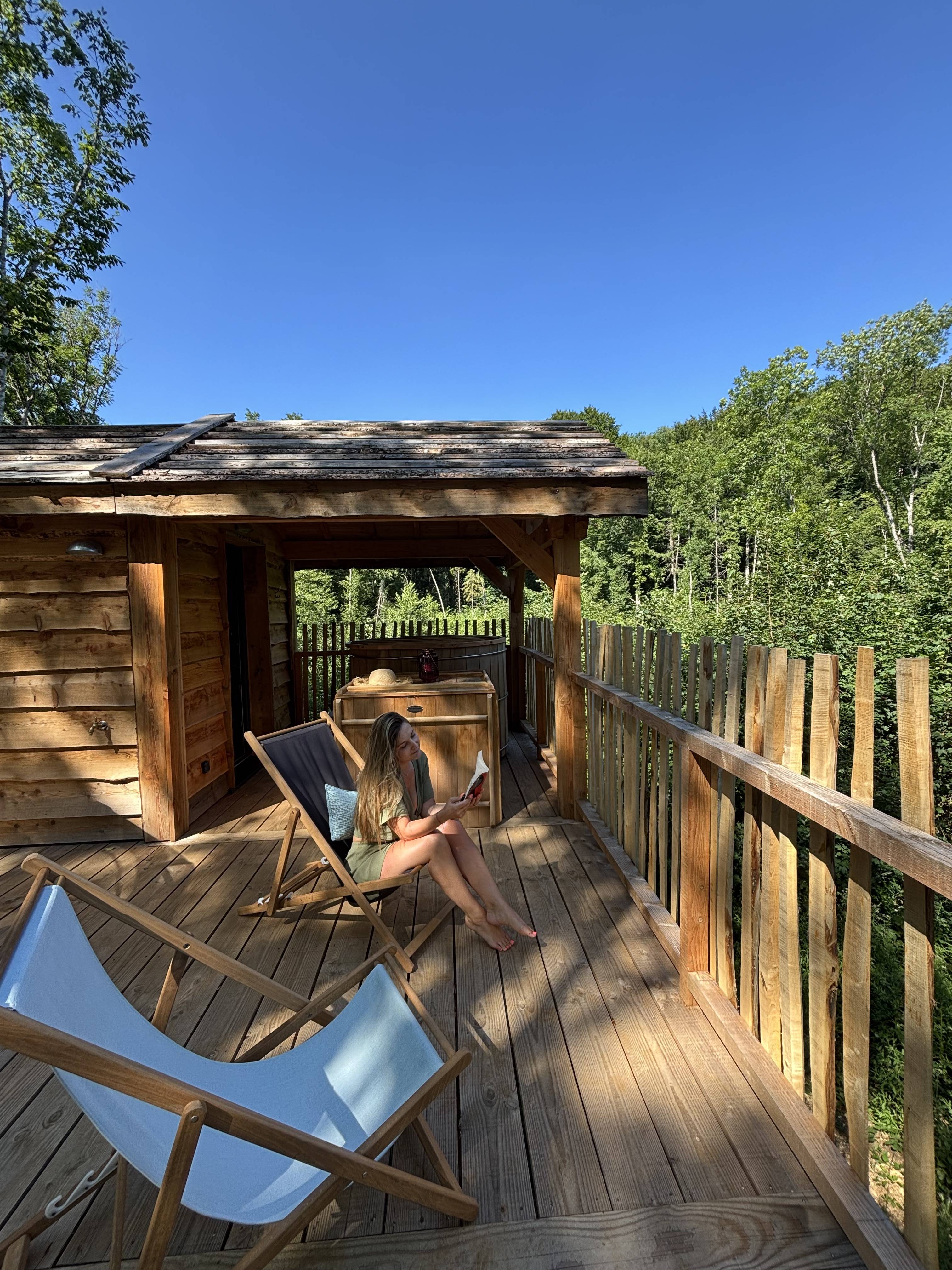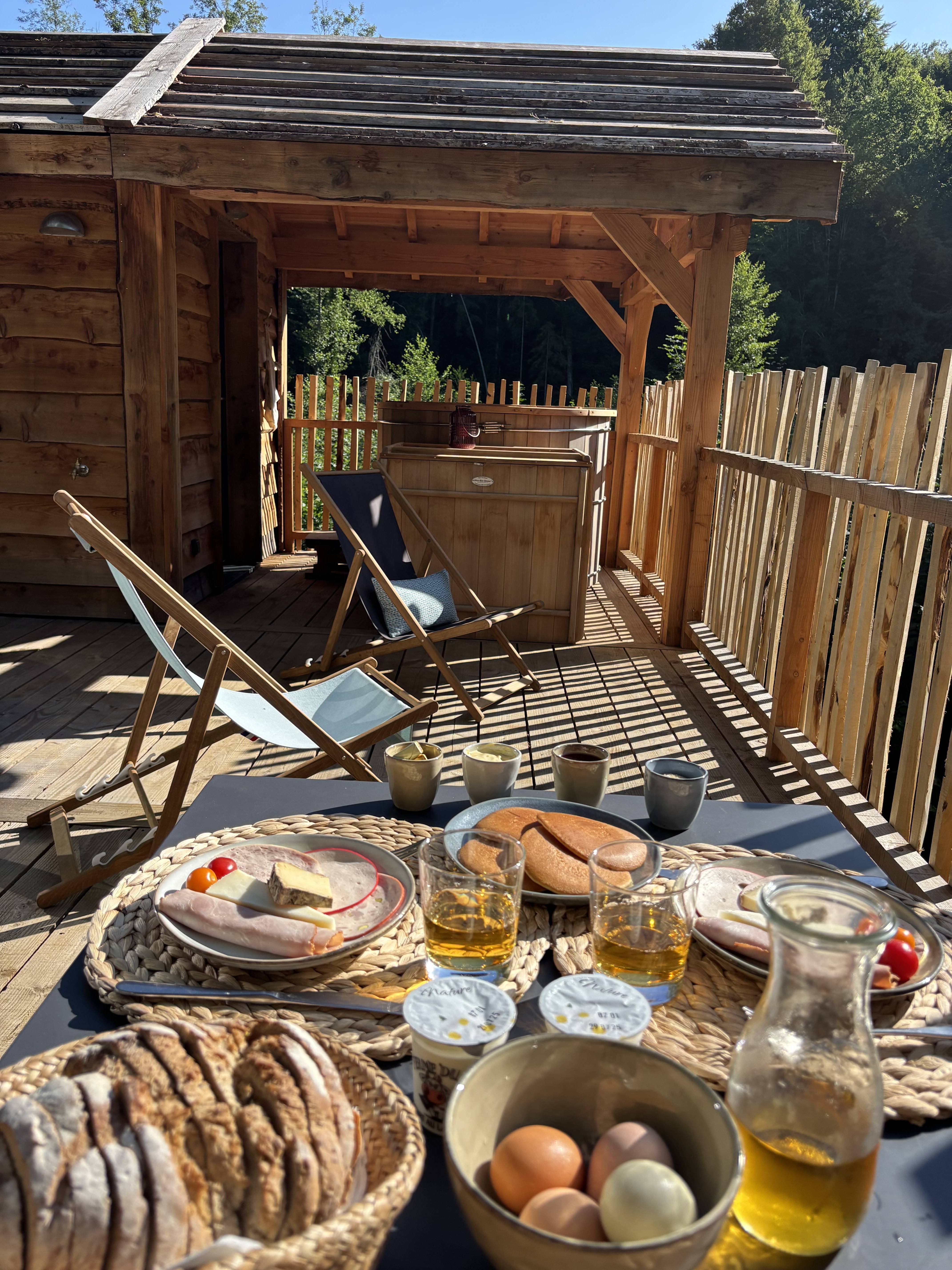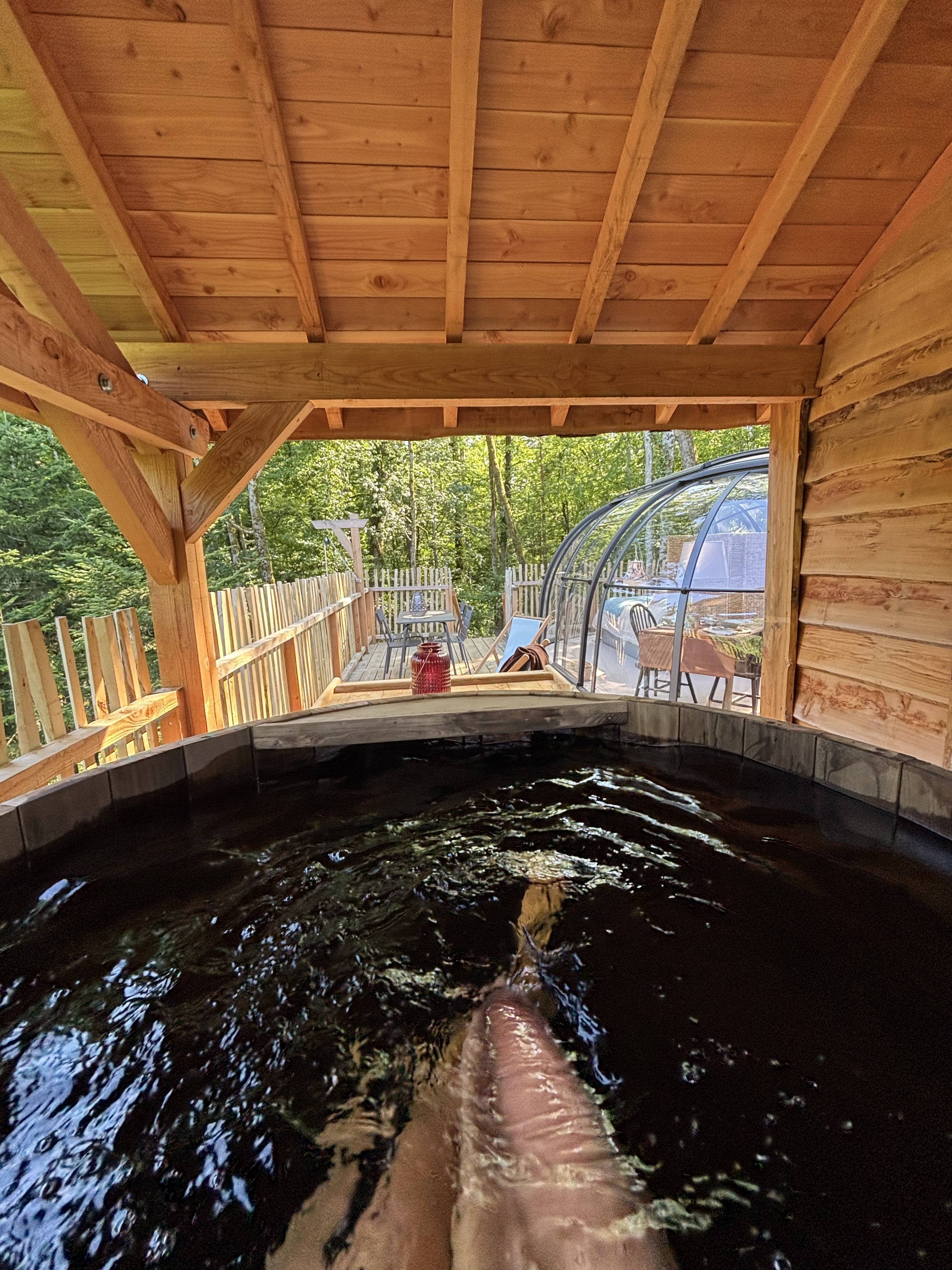 Sous l’auvent de la cabane - salle d’eau (douche, lavabo et toilettes eau), se trouve le bain nordique. Il sera chaud à votre arrivée !
