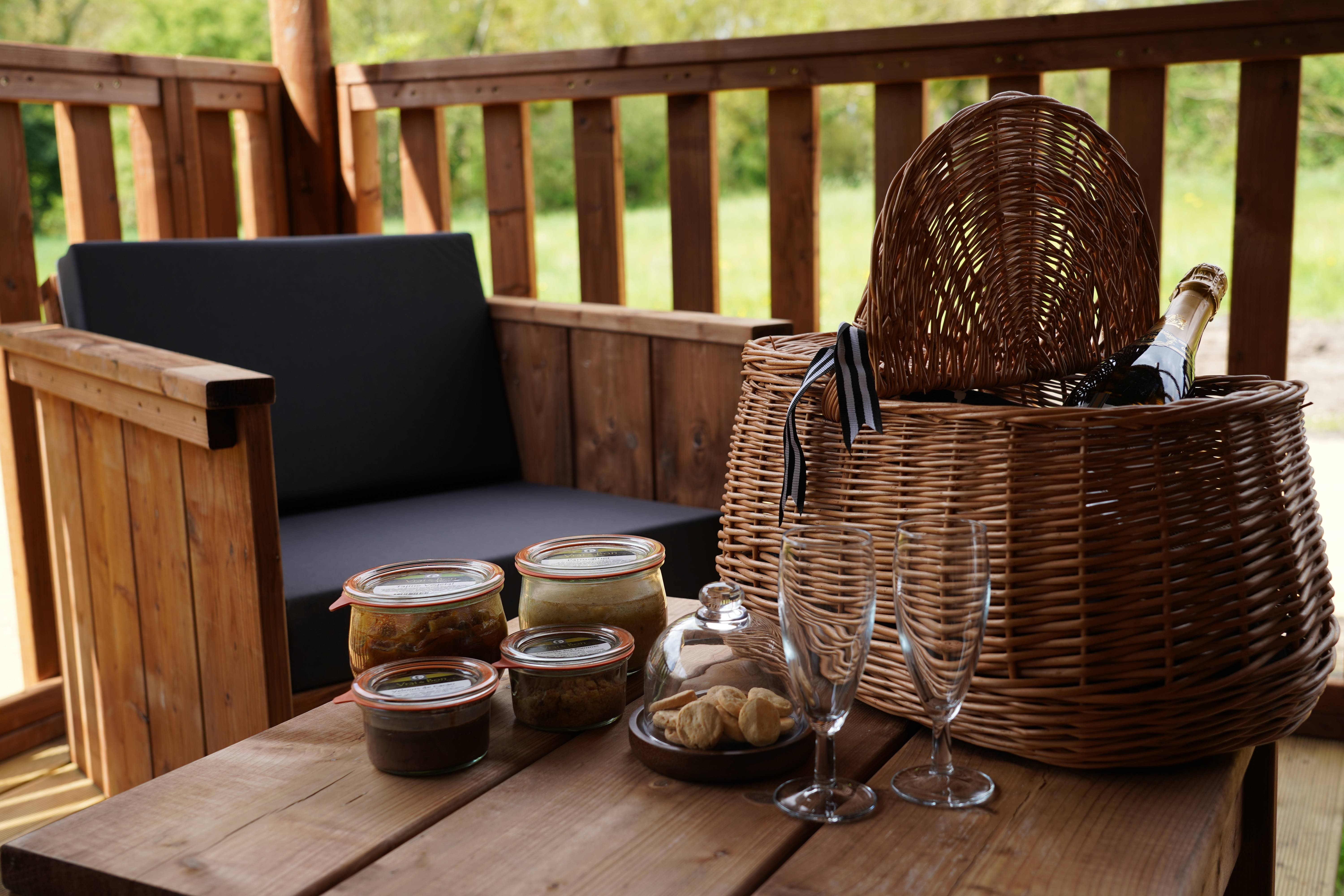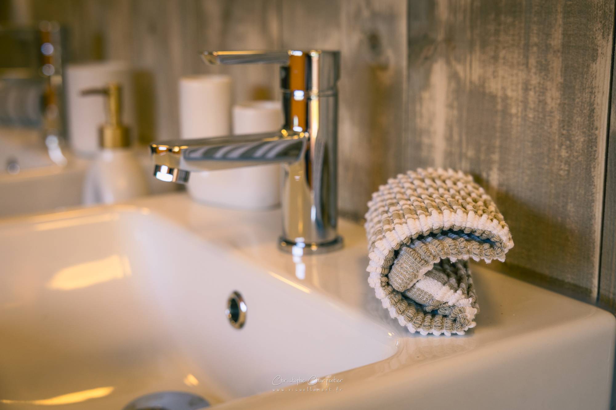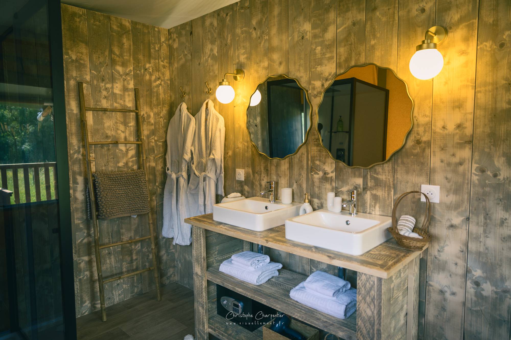 Grande tente mi-bois mi-toile équipée en suite hôtelière pour 2 personnes.