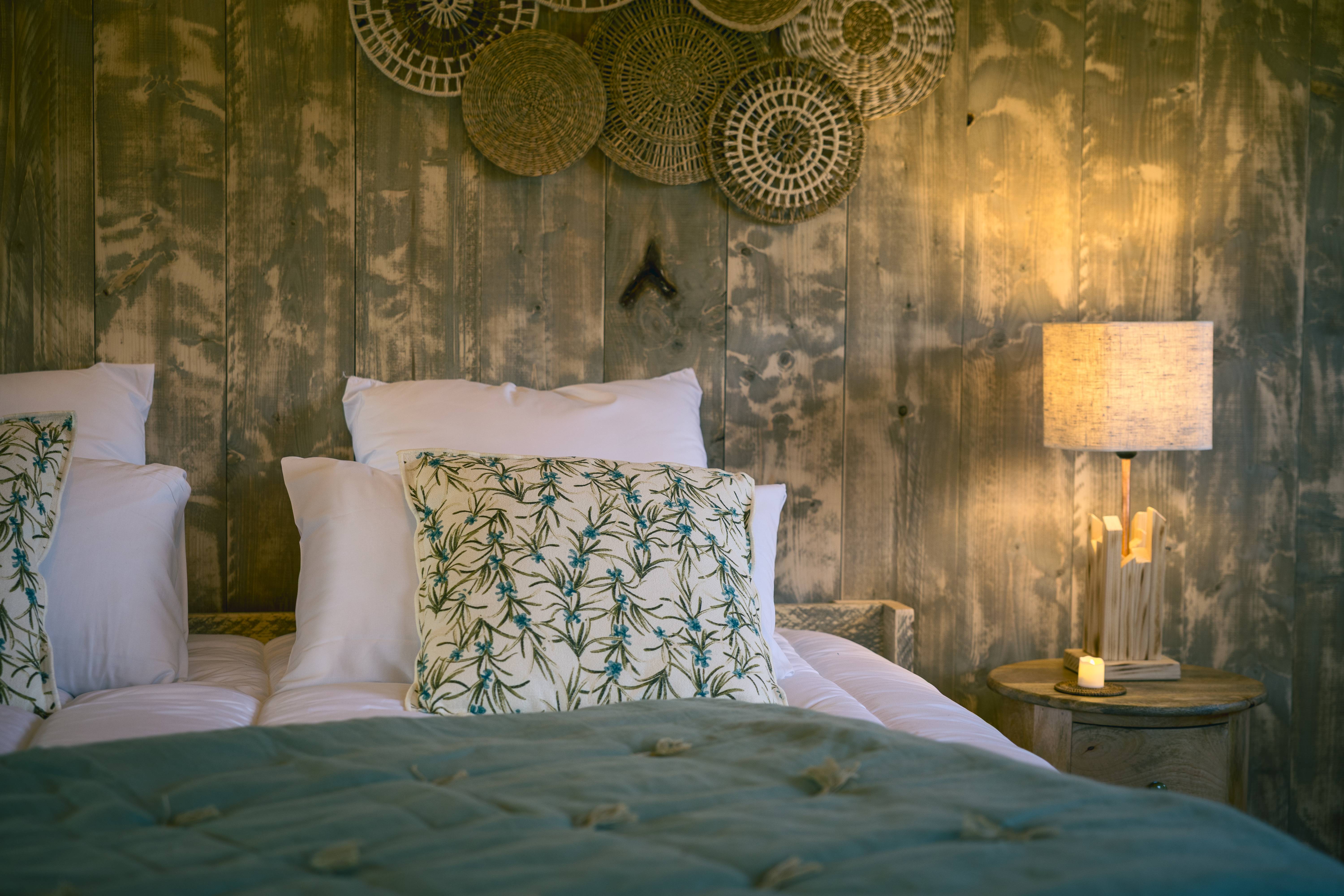 Grandes tentes mi-bois mi-toile équipées en suites hôtelières pour 2 personnes.