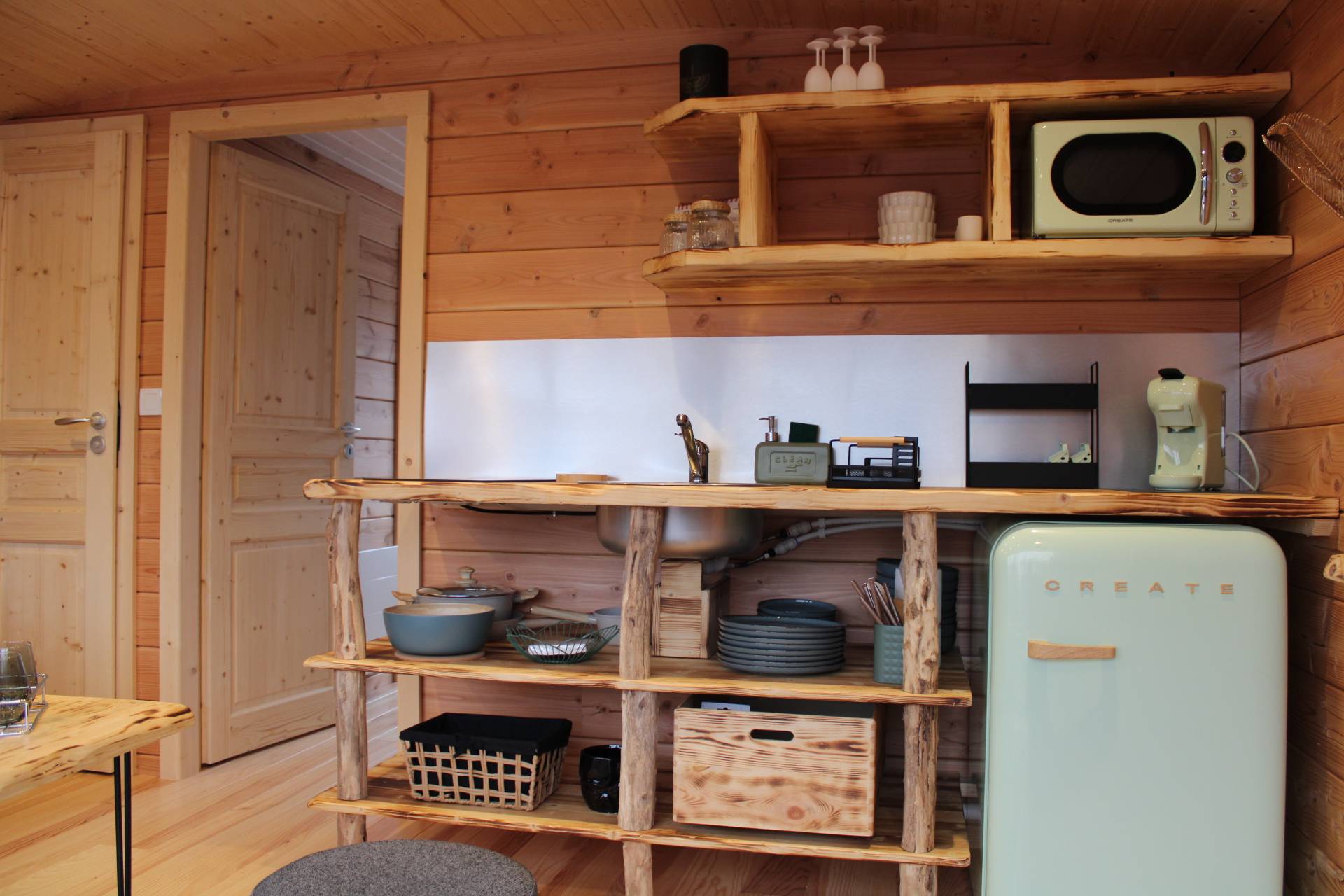 Cuisine équipée (plaques, micro-ondes, réfrigérateur, cafetière).