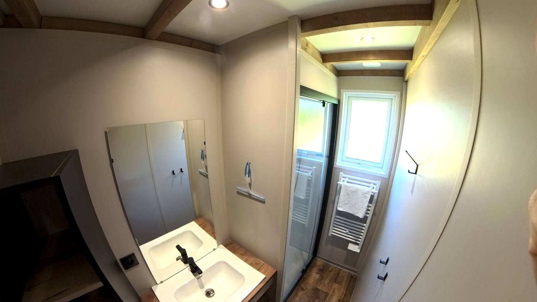 - Salle d'eau avec douche, lavabo, sèche serviettes électrique et sèche cheveux