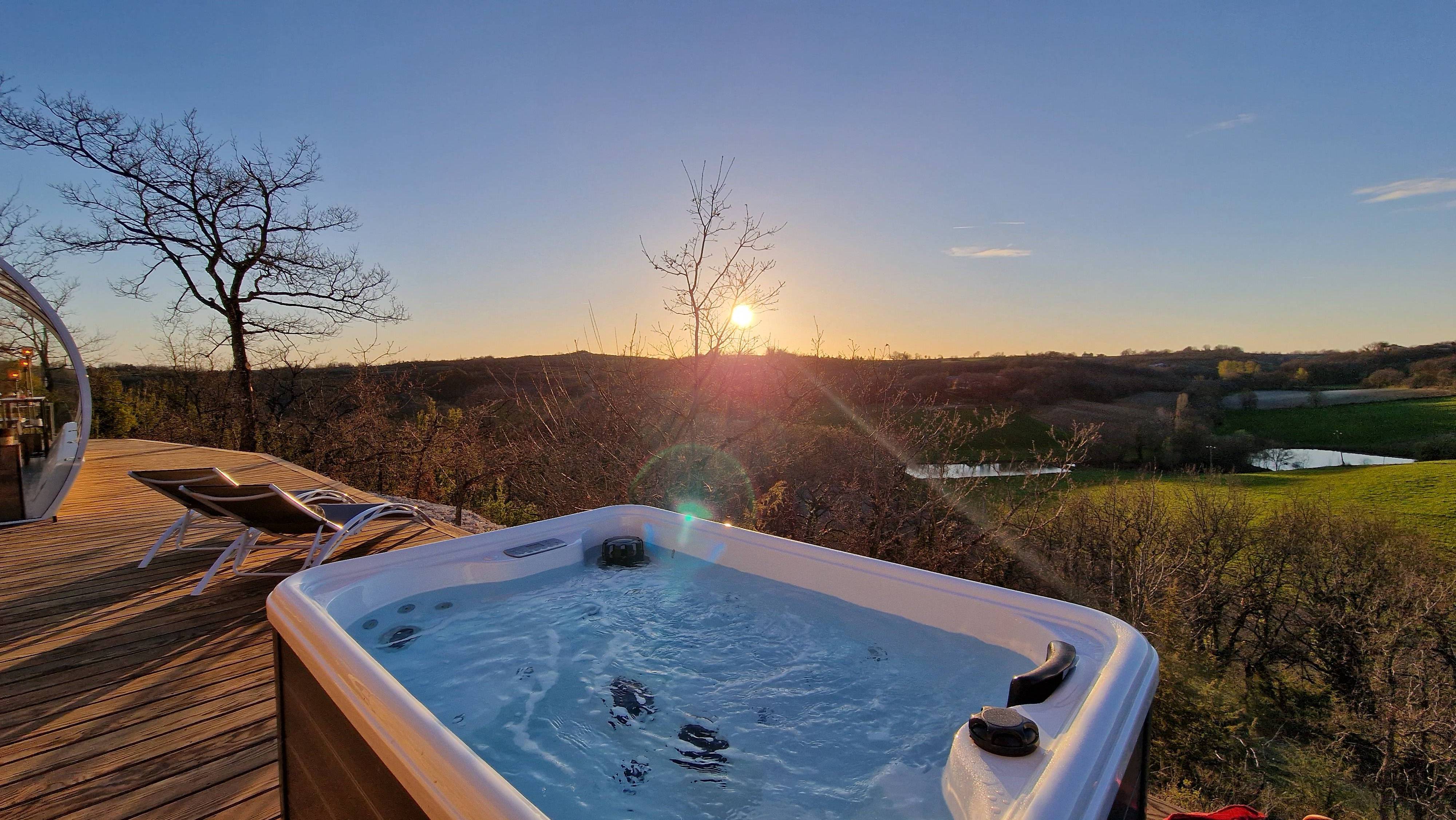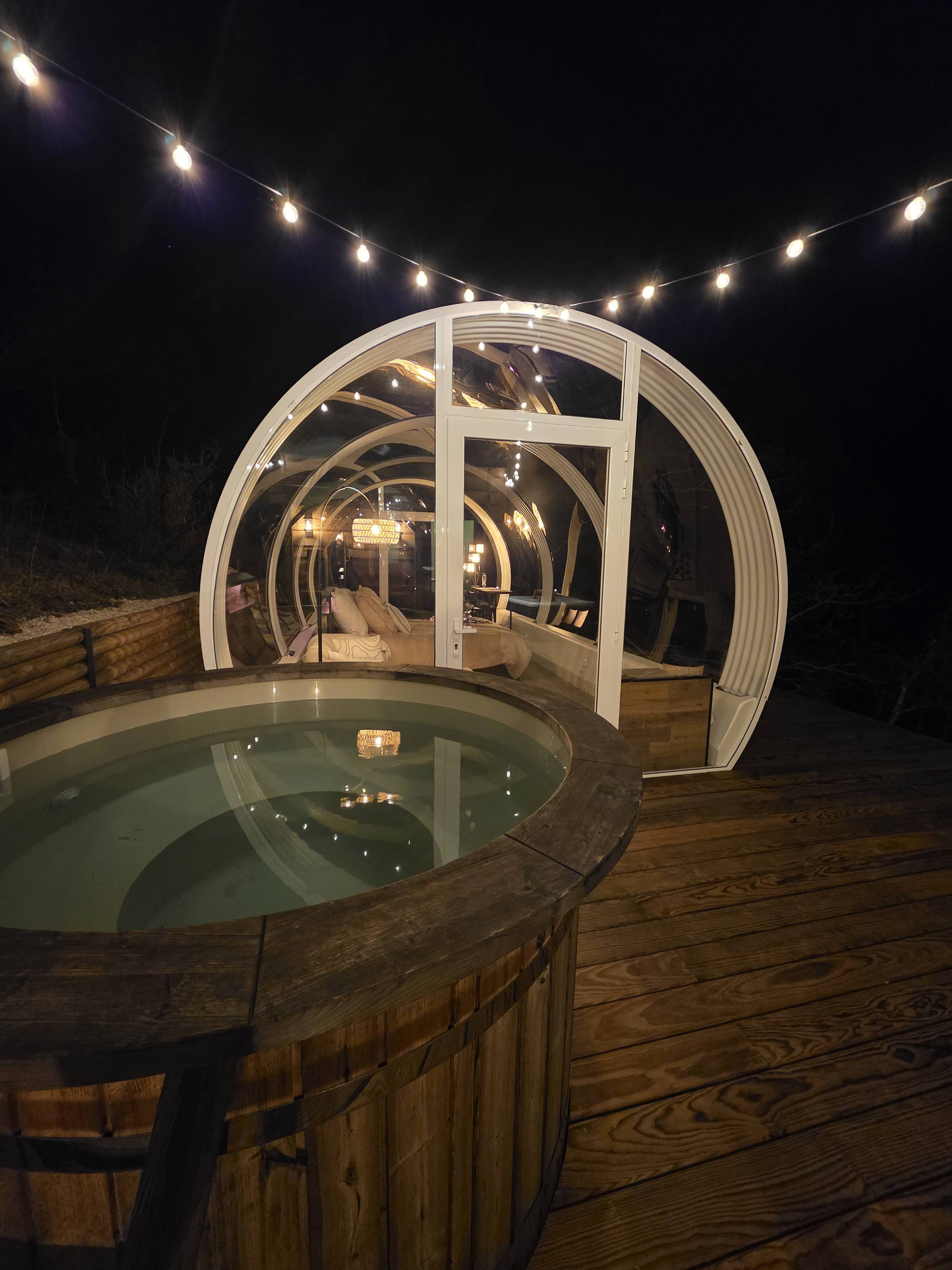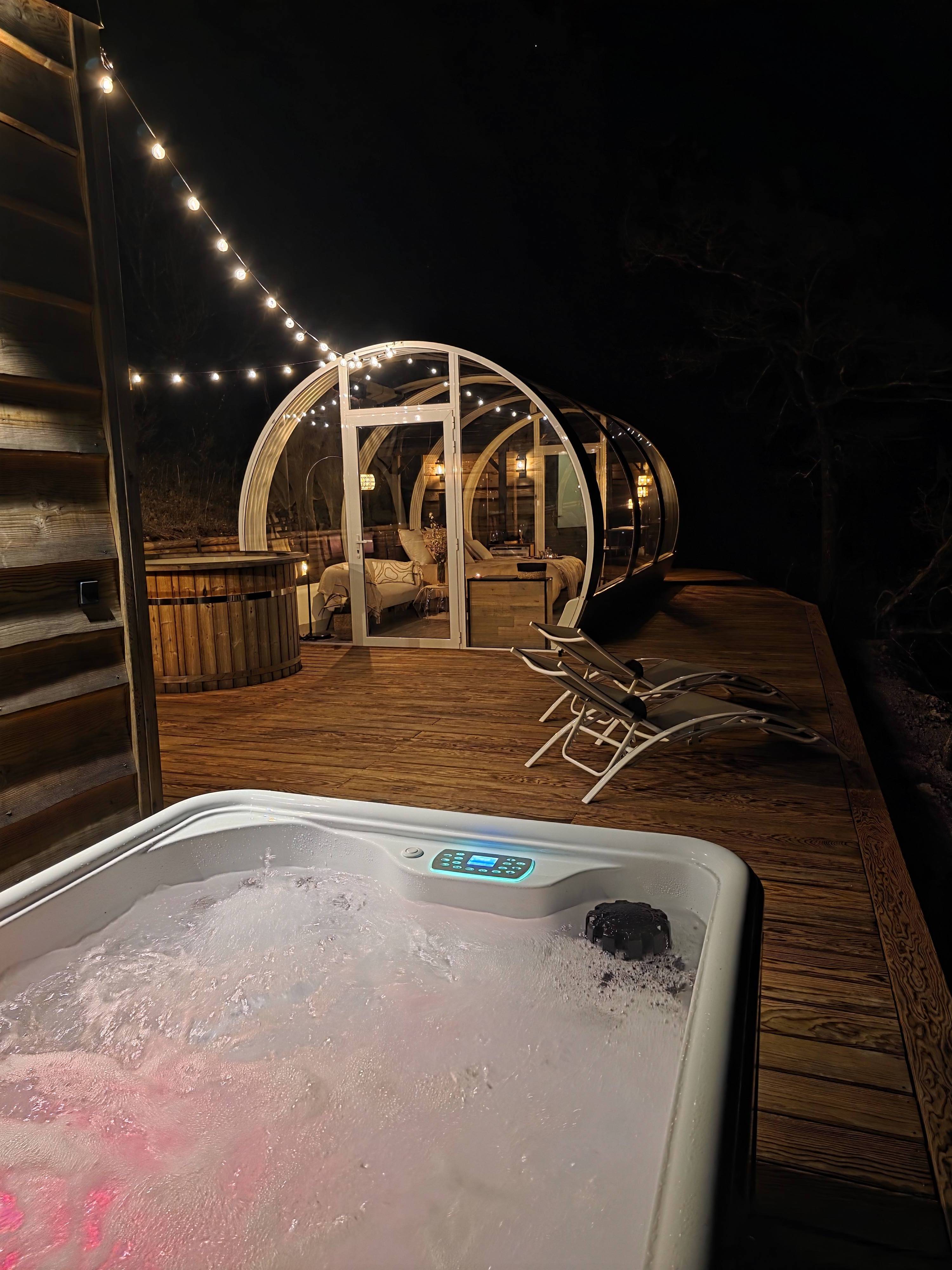 À l’intérieur climatisé, un lit queen size vous promet des nuits douces et reposantes, accompagné d’une salle d’eau privative pour un confort optimal. À l’extérieur, un jacuzzi et un bain nordique privatifs vous attendent pour des moments de détente exceptionnels sous les étoiles. Le coin salon, la table pour vos repas à l’intérieur comme à l’extérieur et la terrasse privative complètent cet écrin chaleureux et romantique.