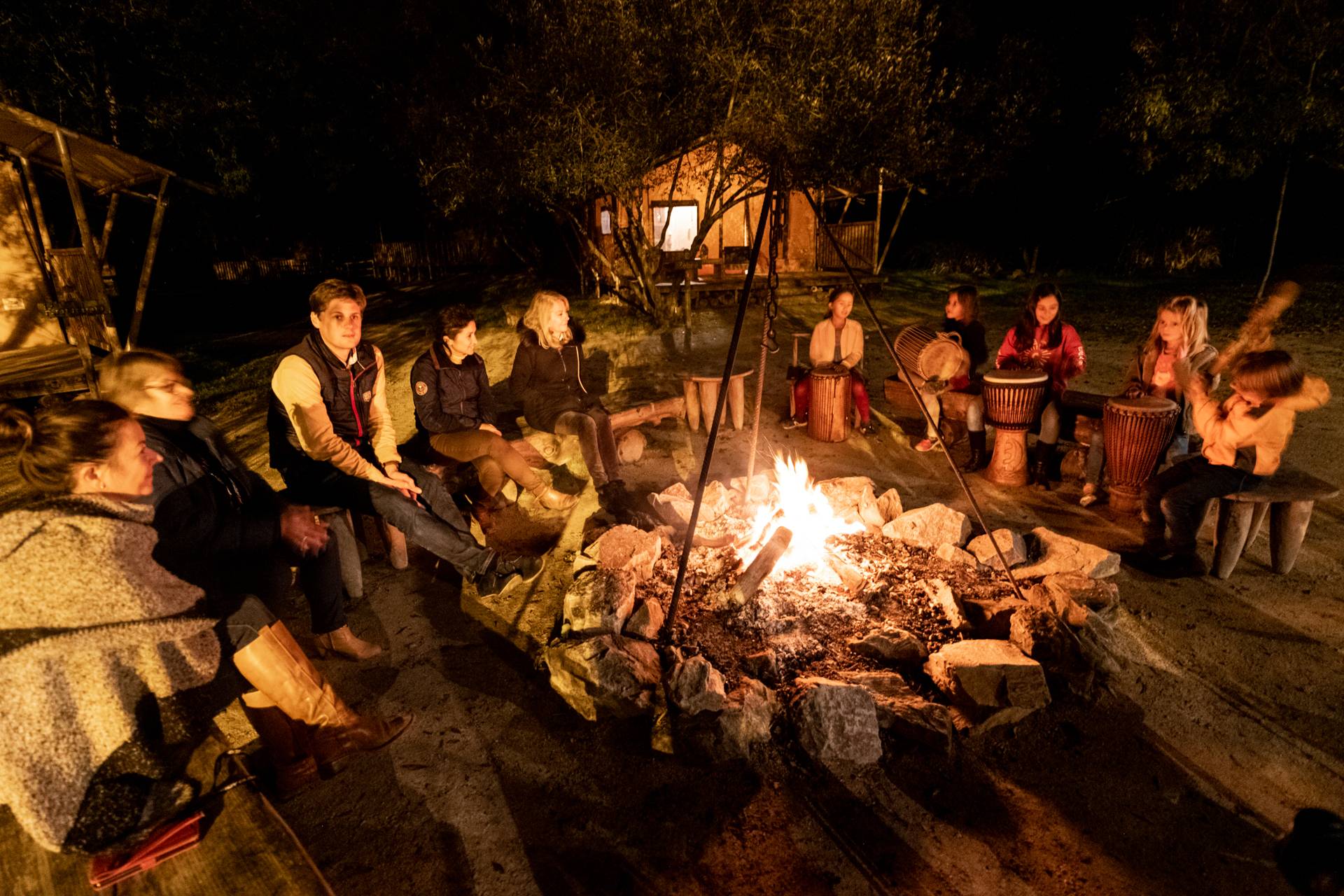 À la tombée de la nuit, la veillée à la belle étoile autour du feu de camp vient clôturer cette 1ère journée. Toujours en compagnie du guide, les histoires circulent, les rires se mêlent aux sons de la savane…
