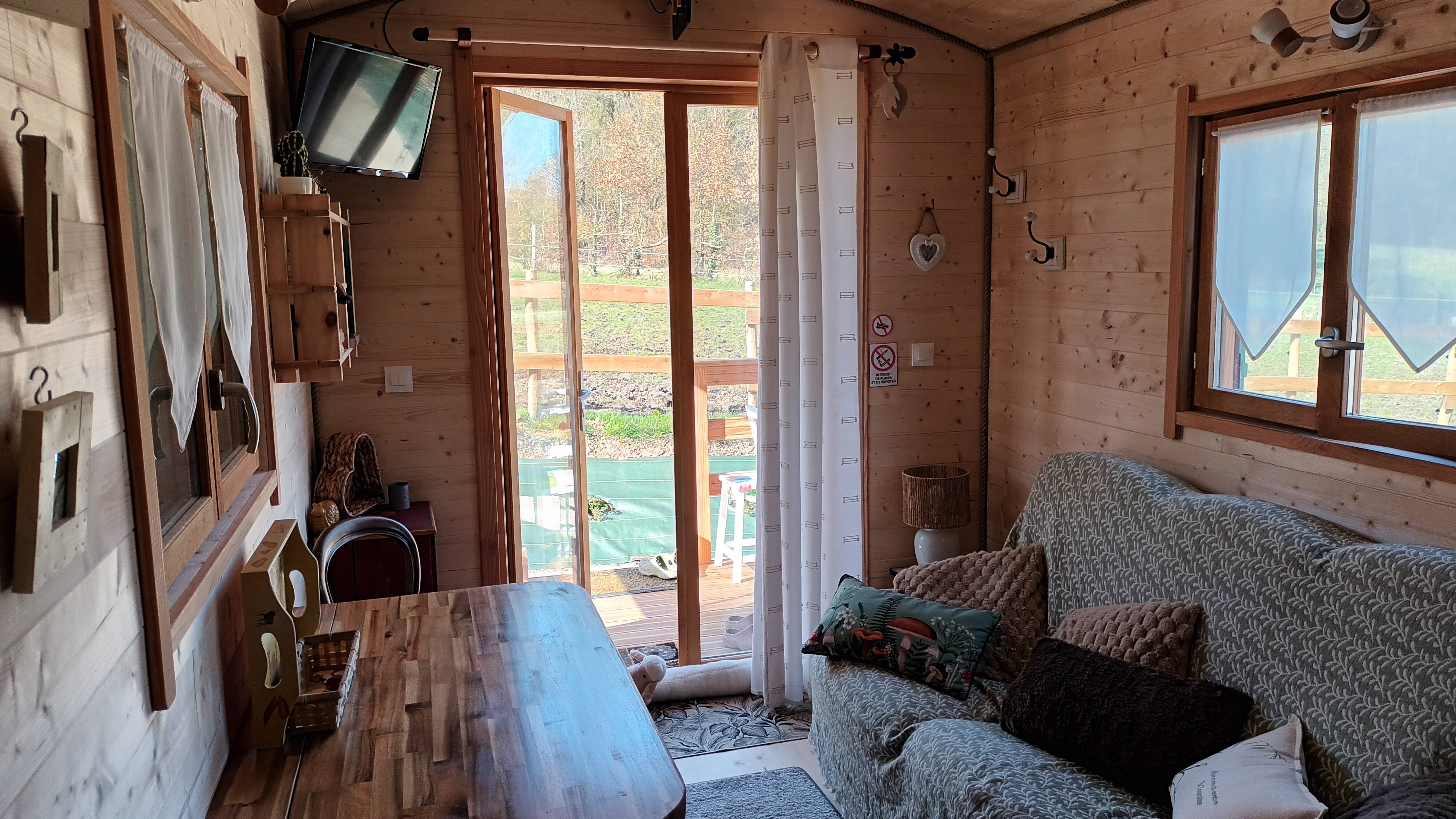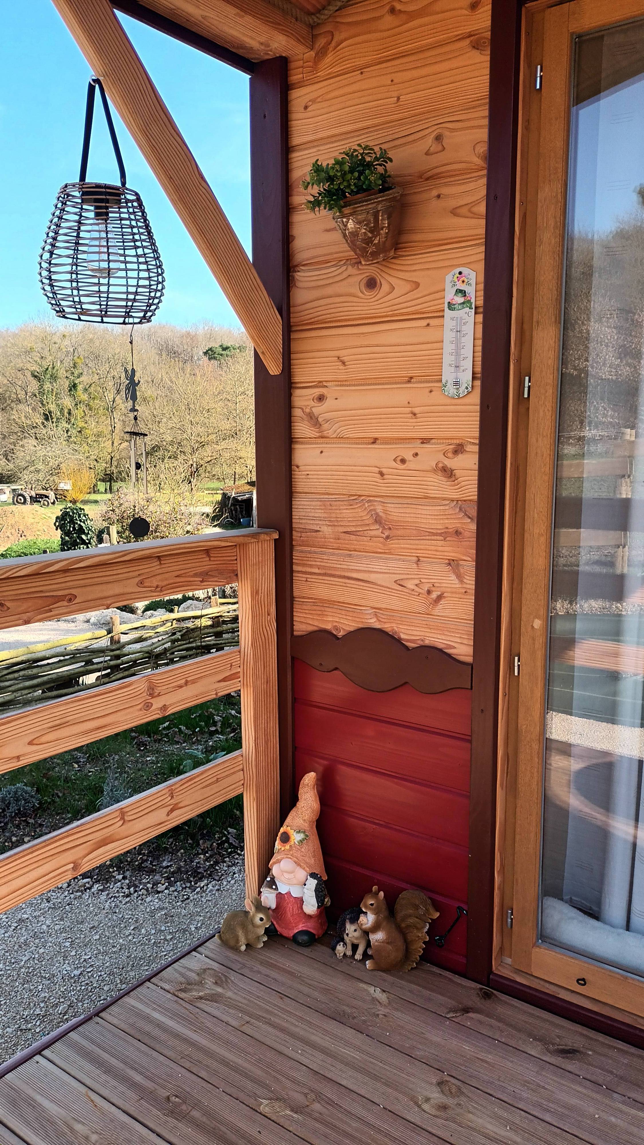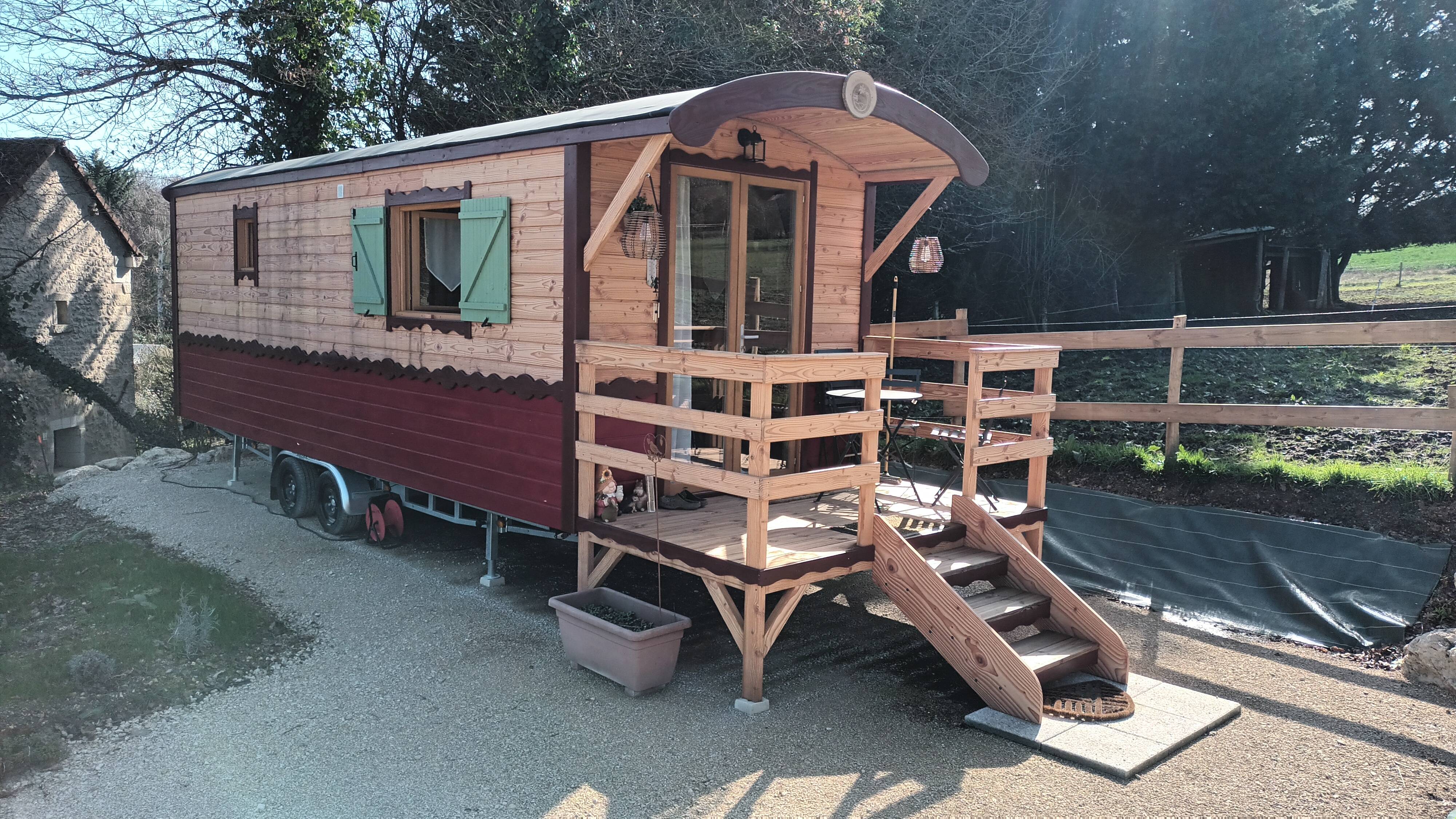La terrasse de la roulotte, vous permet de vous installer pour manger face à la forêt.