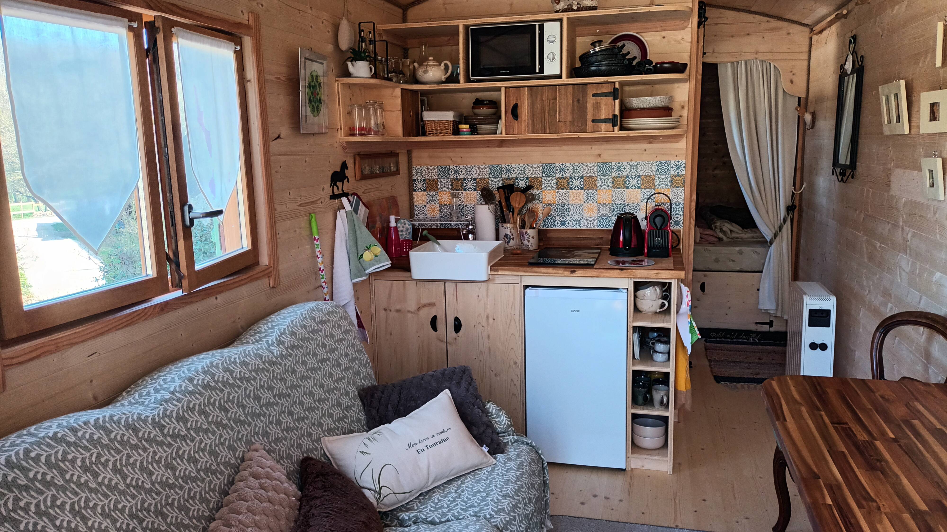 Au cœur des châteaux de la Loire, notre roulotte pour 2 personnes vous attend pour votre séjour en lisière de forêt. Vous pourrez ouvrir vos volets le matin sur le pré des chevaux.