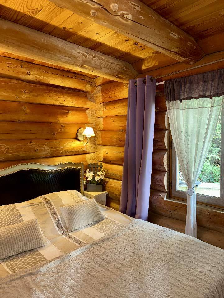 Between Rodez and Aurillac, where the Cantal, Aveyron and Lot departments meet (that in itself is something!), Jérôme and his wife Delphine put down roots in the little village of Montmurat. On their sloping property of 3000 m² with no one in sight, Jérôme built, by hand, this "cabin" that keeps its cards close to its chest: with a rustic appearance, modeled on the work of Canadian woodcutters, it reveals luxurious comfort inside, original decor set to welcoming music by Delphine, who favored noble materials: wood, stone and cast iron. Except for the logs ordered from a wood professional, all is in the hands of Jérôme, including the plans, foundations and insulation! A job for a titan considering that when it comes to logs, nothing squares up! That's not enough to stop Jérôme, who spent almost a year assembling everything, piece by piece. The result is gripping. For the comfort and relaxation of their guests, an open-air spa appeared nearby. It is open all year round, even in winter. Big enough for 5 people, it offers a breathtaking panoramic view, especially at sunset. Delphine and Jérôme enjoy inviting their guests for an apéritif at some point during their stay, to chat and put the world to rights. And since we are in the realm of the quirky, let's not leave! A stone's throw away, visitors will come upon a Siamese village: Saint-Santin, situated both in the Cantal and the Aveyron! The result: in the village square, two churches! Saint-Pierre (in the Aveyron) and Notre-Dame (in the Cantal). Two stadiums, two town halls, etc. Everything comes in twos, except the monument to the dead! A situation that definitely deserves a song!